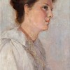Arthur Streeton's admiration for Tom Roberts' portrait of Mrs Leonard Dodds1 was such that he kept a photograph of it on the mantel in his London studio. It stood beside such treasures as the Mention Honorable awarded him at the 1892 Paris Salon.2 Writing to Roberts in November 1898, he described the portrait as 'a rare one, and she'll never have a better.'3 While the portrait admired by Streeton has been long held in Canberra in the collection of the National Gallery of Australia, admirers of Roberts' fine portraits of beautiful and intelligent women have a rare opportunity to secure this slightly smaller work. Although described as a 'study' by Helen Topliss in her catalogue raissone, it is in every sense a complete painting of great charm. It also offers something special, a degree of intimacy not found in the more formally presented larger version. The greater poise and higher finish of the latter is offset by the engaging colour, informality and vivacity of paintwork of the former. Such lively strokes of the brush create a feeling of immediacy in their captured moment of intimacy. Her head is held slightly forward, as if listening intently to an unseen speaker, absorbing what is said to engage in ready reply. It is a delightfully lively work that speaks well of the admired sitter.