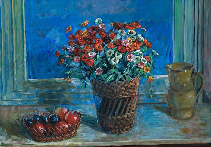 Zinnias and Fruit is special among Margaret Olley's still life paintings for its extensive use of blues, providing an effective contrast to the reds of the flowers and apples. Olley's paintings, celebrated for their rich colours, usually enjoy a predominance of browns and reds, expressing the warmth of the artist's personality and her conviviality. Cedar furniture in its natural state, or a brightly patterned kilim often provide the keys to the moods of her paintings, the lively strokes of her brush giving her works a particular vivacity. The colour blue in Zinnias and Fruit, strikes a different note, more given to a nocturne or a serenade than the scherzo mood of so many of her works. The blue background of the window suggests night, giving an overall mood of peace and quietude. There is no view through to the garden or landscape beyond, another feature of many of her paintings. Instead, by reducing pictorial depth to the minimum, she focuses attention on the foreground, the very objects of the still life. Individual to this painting, the gentlest light falls from the upper right, casting the lightest of shadows. Her objects perform rather like actors on a stage, brought forward to its edge and their appreciative audience. A similar example is the splendid Ranunculus and Fruits I, 1973 in which her cast of fruit, flowers, jugs and vases provide bright highlights against the deep blue backdrop.1 The pictorial device of the dark window is used to great effect in several other comparable paintings such as Evening Still Life, c.1976 and White Still Life, 1977.2