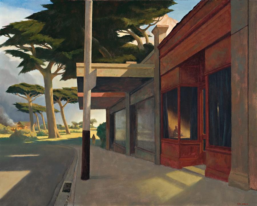 From the late 1980s onwards, Amor began to explore memories of his past, of his youth at Frankston, the town and sea nearby. It began with the charcoal Study for Town by the Sea, 1989, and its companion oil, and continued in A Town by the Sea (Looking Back), each prefiguring our painting in the angled street scene, figures in shop windows, ubiquitous telegraph pole, and other details. In the following years, Amor painted a number of Frankston paintings which Gary Catalano has pointed out, 'cumulatively help to create a detailed picture of the Frankston in which he spent his childhood: the places of enchantment and fear are pictured in them, as are some of the personalities that, for whatever reason, loomed large in his imagination.'1 The theme and individual motifs continued to appear over the years. In Memory of a Guest House - Miss Prosser and the Albino, 1992, a figure looks through the long, parted curtains of a shop window. Evening by the Sea 1998 takes a darker, more distant view of the scene in our painting, complete with motionless figures and the calm before the storm forecast by red clouds. Cypresse (A Town by the Sea), 2005, is another variation on Amor's theme of loneliness and isolation. Afternoon by the Sea, 2005, presents a masterly summation of all these paintings, the previous deeper shadows of evening and night now giving way to those of day.