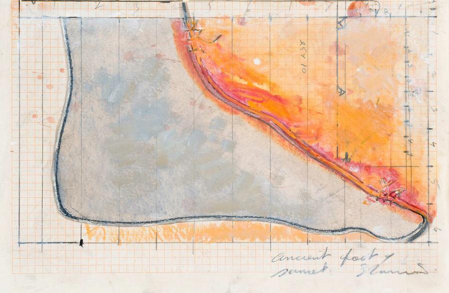 signed and inscribed lower right: ancient foot sunset: Storrier