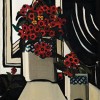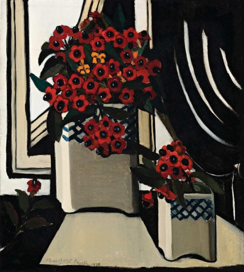 Maugham could have been writing about any of the above paintings, including Australian Glory Flower, for each is striking in its bold simplification, emphasis on geometric form and strong colour. She was at her best in the inventive use of composition. For a brief period from 1927 to 1928 her more conventional painting was overlapped by a modernist geometric phase, distinguished by greater simplification of design in which she reduced the pictorial elements of each painting to a few single, striking motifs, powerful in their appeal. The same can be seen in her colour woodcuts, none better than Wheelflower (the block was cut c.1928), which she regarded as one of her best, being 'one of the few prints that she retained in her collection.'3 The print and paintings shared a new bravura and dynamism as Preston moved from mere representation to explore the underlying structure and inherent geometry of her objects. A concentration on the essential, combined with a greater emphasis on the flatness of the picture plane and using such devices as tilting tabletops, resulted in an appealing balance and fusion of naturalism and geometricism. All these features are found in Australian Glory Flower, including a greater clarity, and an ongoing interest in the visual drama of stripes. Here, more audacious use of white introduces another Preston characteristic of offsetting strong colours such as red with the neutrals of black and white. In 1927 Ure Smith described Preston as being at 'the very front rank of present day still-life painters'.4 Australian Glory Flower is among a select group of paintings that confirm this observation.