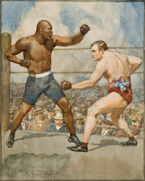 A hustler of the first order, McIntosh was a friend of Norman Lindsay, who designed his book-plates. No doubt Lindsay's promotional watercolour for the front cover of that December issue of The Lone Hand was due to McIntosh's friendly persuasion. A highly popular magazine, its conception was due to Lindsay and Frank Fox, assistant editor of The Bulletin. Published in Sydney from 1907, it encouraged an independent Australian culture and supported local writers and artists. Contributors included the poet Hugh McCrae and art critic William Moore, illustrations were by Lionel and Norman Lindsay, Hans Heysen and B. E. Minns, and articles were written by such notables as Billy Hughes and Nellie Melba. Two articles in the December 1908 number described the fighters. Johnson was 'Six feet and a quarter of copper colored brawn and muscle'.1 His physical dominance was depicted by Lindsay. In contrast, Burns was 'barely 5' 7''. Moreover, Burns' face was said to suggest 'a portrait of Napoleon I.'2 Again Lindsay obliged, capturing the Napoleonic profile and smaller stature in a page of black-and-white studies and on the colour cover.3 He also portrayed Burns in his characteristic 'crouching style', an image of the tenacious underdog against the 'Galveston Giant', the American Negro champion. For some, the world had collapsed with the outcome of this event.