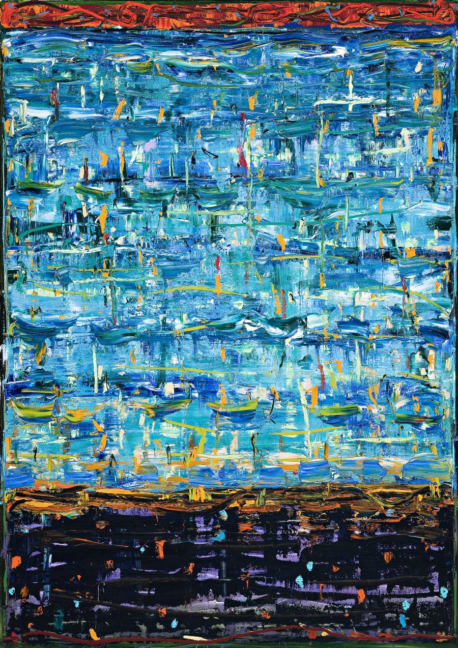 During the 1980s, the Polish town of Jarocin was the home of one of Europe's biggest and most important rock music festivals, the Jarocin Festival, and it was occasionally referred to as the 'Polish Woodstock'. The music of the three-day fest included 'alternative', rock, heavy metal, punk rock and blues. The visually fascinating richness of the fields of colour and textures in Johnson's Jarocin Blue express something of the lively atmosphere of the Festival. It is interesting to note, however, that although there is a strong feeling of energy and physicality about this and others of his paintings, and that he approaches them with gusto, they usually take three months or more to complete. Johnson has said that 'there are roughly seventeen layers on each.'2 Starting with the shape of the canvas and the picture's mood, Johnson 'compares himself to a musician, with the canvas as his instrument.'3 Jarocin Blue is a characteristic and highly engaging example of Johnson working at his best.