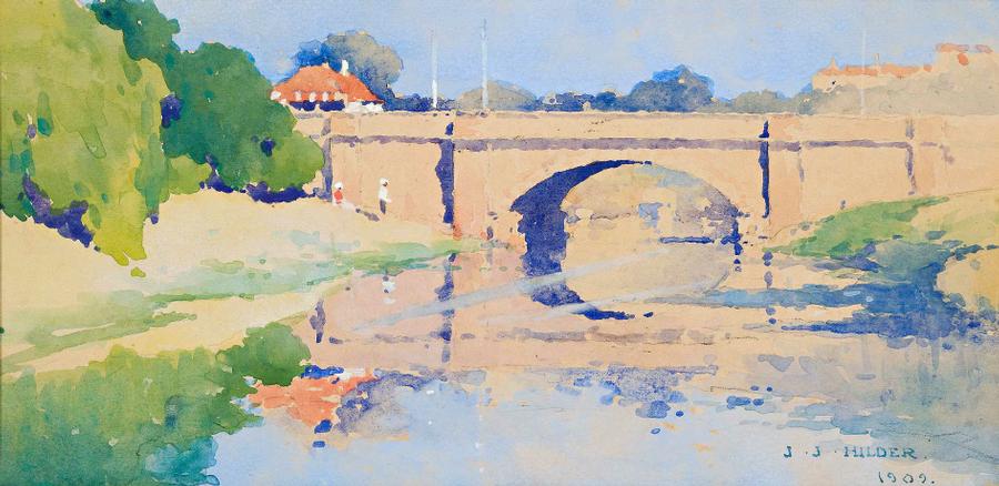 The year 1909 was an important one for Hilder, witnessing his marriage to Phyllis Meadmore, and taking up painting full time. In September, they moved to Parramatta where their first son was born the following month, and this, the first of his Lennox Bridge watercolours was painted. Completed in one of the happiest times in his tragically short life, the historic bridge is bathed in the joyous warmth of spring sunlight, its image reflected in the still waters of the Parramatta River. Hilder's bridges were a favourite subject, collected by Sir Baldwin Spencer, Elioth Gruner, J. C. Traill, Dr Samuel Ewing and others. The motif features in his work from 1907 onwards, including Parramatta Bridge, 1910, and Lennox Bridge, Parramatta of December 1914 (Art Gallery of New South Wales). Designed by David Lennox, the colony's first Superintendent of Bridges, it was built with convict labour in the late 1830s, and is one of the oldest bridges in Australia. Hilder delighted in the presentation of its form and sparkling reflection, through the contrast of the warm colours of the stone with their deep shadows of blue. While a wistful charm pervades his later works, Lennox Bridge, Parramatta, 1909 is redolent with the peace and intimacy of the captured moment. The work of a romantic perfectionist, it offers a ready insight into why the first public exhibition of his work in 1907 was regarded as something of a sensation, readily winning the enthusiastic praise of Arthur Streeton.
