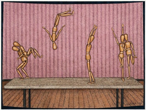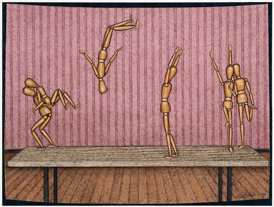 More specifically, the motif may be perceived as referencing the next generation - the dancing and tumbling dolls emblematic of children learning to interrelate. As Christopher Heathcote intuitively argued at the time of the series' inaugural exhibition, 'The cipherlike unpainted dolls appear to denote psychologically unformed children. As for what they are doing, the gymnastics and ballroom dancing is an allegory for children learning social rituals, with each doll practicing [sic.] how to behave and interact with others.'2 Thus, although tinged with the artist's personal darkness, such manikin paintings are noticeably bereft of his past pessimism for the ills of the world - embodying rather hope and acceptance of the greater replenishing cycles of life.