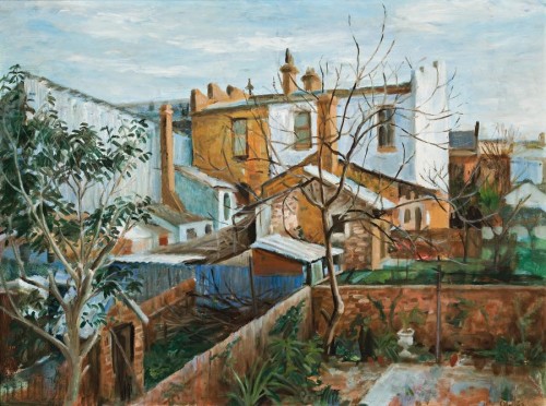 Strachan eventually returned from Europe in 1960. In 1962 he settled at 163 Paddington Street, his home for the remainder of his life. Olley visited him frequently and painted in his house. The View from David Strachan's Kitchen belongs to this time, a characteristic view over backyards and rooftops. Three years later, Strachan painted a similar view, Paddington Backyards, in a private collection. Olley's painting is a pleasing reminder of her ability as a landscape painter as first seen in those 1940s and 1950s landscapes of Hill End, North Sydney, Brittany, Paris and Cassis. The quality of these paintings reminds one that Lloyd Rees as judge awarded Olley the 1947 Mosman Art Prize for her painting, New England Landscape. When Strachan died suddenly in a car accident in 1970, Olley was devastated. During the following year, she painted a large number of works in Strachan's Paddington house. Under the title Homage, they were shown at Brian Johnstone's Brisbane gallery in 1972, a deeply moving tribute from one artist-friend to another.