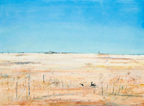 Wimmera Landscape belongs to the later 'Wimmera' subjects painted in the early 1960s in which he continued to use tempera as a favoured medium. As in the earlier Irrigation Lake, Wimmera, c.1950, also in the National Gallery of Victoria, tempera combines a subtle, opalescent glow with immaculate surfaces. It provides the perfect foil for the scruffy landscape of skeletal trees, bushes and grasses that untidily sport across its surface, peopled only by black crows and a lone figure in the middle distance. The endless blue sky adds to the feeling of openness, of land and heavens divided by an horizon that seems to stretch forever in a land that celebrates its own barren dryness.