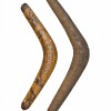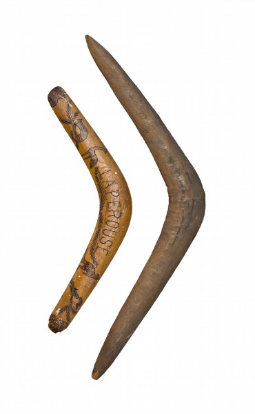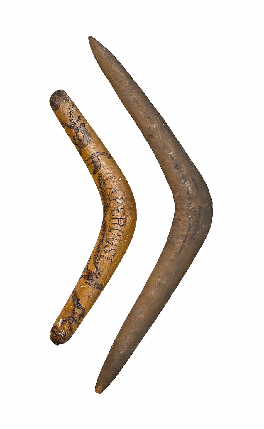 During the 1880's an Aboriginal camp was established at La Perouse. A tourist market was established later where it was possible to purchase artefacts and watch displays of boomerang throwing. The engraved designs of fauna and flora on the smaller boomerang included in this lot are typical of the decoration applied to shields, boomerangs and other artefacts that were available for the visiting tourists to purchase