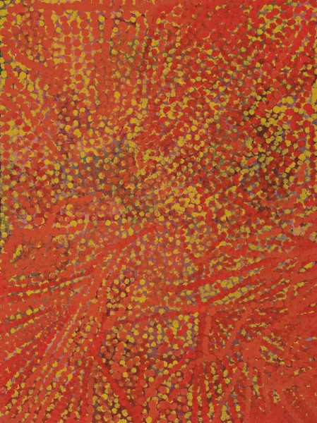 Kngwarreye depicts the abundant fruits and flowers of the watercourse areas of her country. But the dominant motif in this painting is the wandering line of the roots of the Yam plant Anooralya. The artist's paintings are a celebration of her whole world executed with the confidence and strength that underpins her practice. In this work we find the elements that appear over again in Kngwarreye's paintings; the overlaying of dotting and the build up of colour, the sequences of dots aligned between or over lines, the short dashes and lines, the meandering lines that in later paintings became the singular expressive element of her work.
