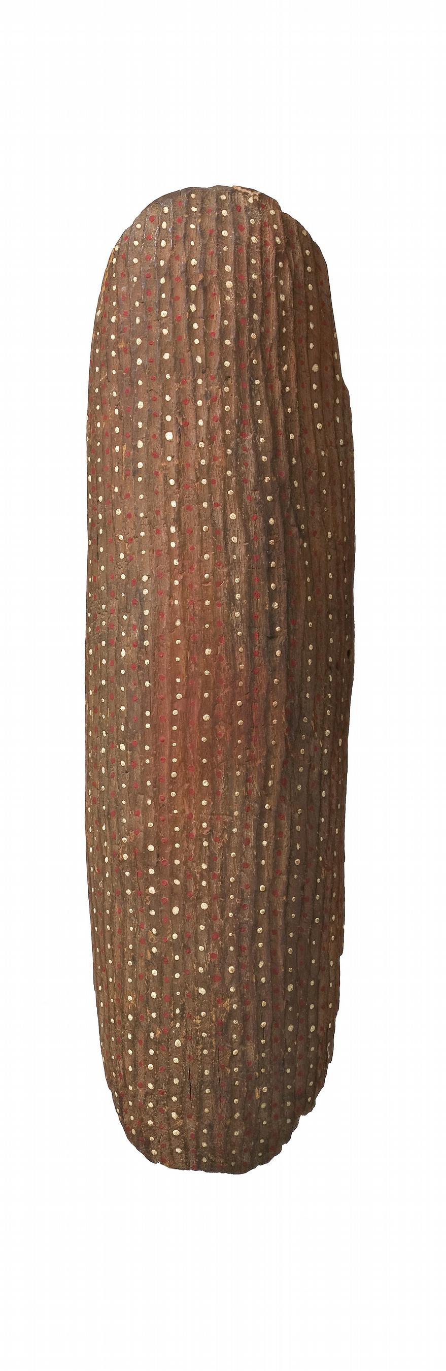 carved softwood with vertical carvings and natural earth pigments, the front decorated with broad vertical linear designs infilled with alternating rows in white and red pigment dotting. The reverse with broad deep cut shallow fluting and lug handle with remnants of old trade cloth on handle.