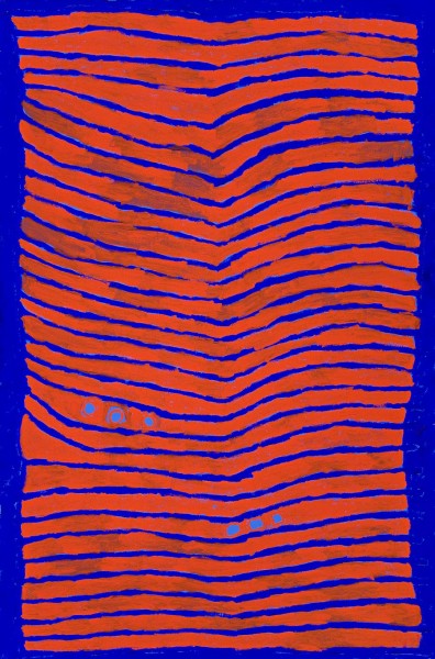 This painting is accompanied by a certificate of authenticity from Short St Gallery which reads, 'I was born in Kalpirti, but left this country a long time ago. It is the place of the old people, my mummy and dad's place. Kalpirti, this is where my brother and sister were born too, and where my old people died. We ate miningali (damper), bingala, warlji (bush tomato) lots of mayi here (bush food). There is lots of junbi (tall grass) in the tali (sand dunes) where binya grows (a white food that grows on the trees).'