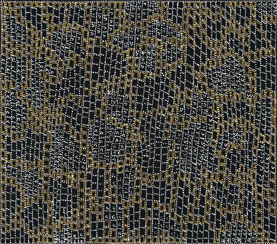 This painting is accompanied by a certificate of authenticity from Gallery Gondwana which reads in part, ‘This painting depicts a major women's ceremonial site known as Mina Mina, the artists's custodial country, located near Lake Mackay in the Tanami Desert, north of Yuendumu in the Northern Territory. During the Jukurrpa ancestral women of the Napangardi and Napanangka sub-section groups (aunt/niece relationship, in which knowledge is passed from one to the other) gathered to collect ceremonial digging sticks (karlangu) that had emerged from the ground. They then proceeded east, performing rituals of song and dance, to the place known as Jankinyi. A large belt of trees (Casuarina decaisneana) now stand where these digging sticks once were.’