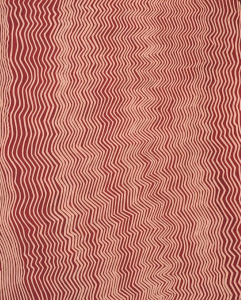 This painting is accompanied by a certificate of authenticity from Papunya Tula Artists Pty Ltd, Alice Springs which reads in part, 'This painting depicts designs associated with Kirritjinna, a rockhole site north of Jupiter Well. In mythological times a large group of Tingari Men camped at this site before travelling through Naru and Kiwirrkura to Wilkinkarra (Lake Mackay). The lines in this work represent the sandhills in the area through which they travelled. During their travels the senior men were instructing the younger ones in the group.'