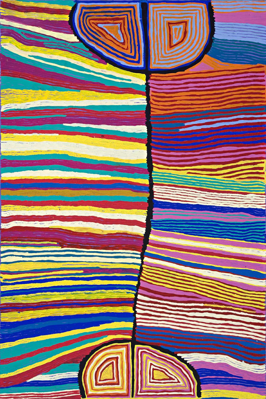 Born at Yarungkanji, Mt Doreen Station, Judy Napangardi Watson had a traditional life growing up in her ancestral country at Mina Mina andYingipurlangu, situated on the border of the Tanami and Gibson Deserts.Despite flanking these major deserts, the country is particularly fertile, producing a bounty of bush tucker whose vibrant forms and hues form the foundation for Watson's use of colour.