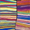A central compositional device in this work is the central black line, representing a fringed hair stringed belt. Dividing the painting in two, the black line of the belt is surrounded and overwhelmed on both sides by bands of vibrant high key colours. Bold oranges and pinks, light and dark blues are interspersed with bands of white and yellow. The dragged dotting technique created ripples of colour representing the country and the constant movement of the women as they traverse it.