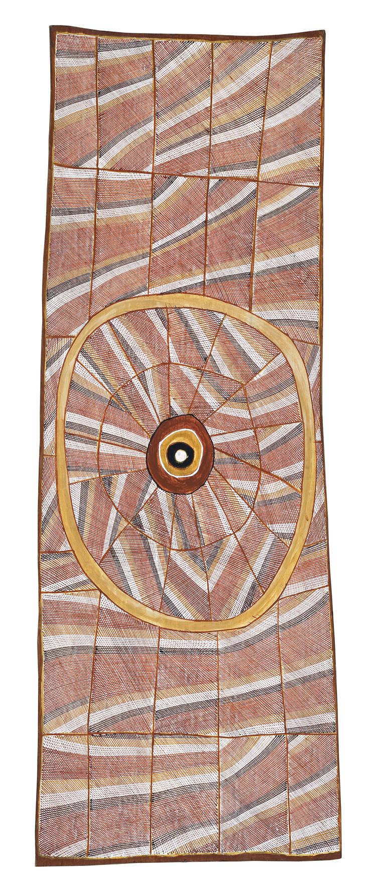 Mawurndjul has had a meteoric career. In 1981 he was included in a group exhibition in Paris, Les magicians de la terre at the centre Georges Pompidou, then followed by a solo exhibition in 1991 at Gallery Gabrielle Pizzi, Melbourne. His work was featured in the 12th Biennale of Sydney in 2000 and in 2002 he won the bark painting prize at the National Aboriginal & Torres Strait Islander Art Award, Darwin. In 2003, he was the first indigenous artist to win the Clemenger Contemporary Art Award held at the National Gallery of Victoria and in the following year his works of art were included in Crossing country: the alchemy of western Arnhem Land, at the Art Gallery of New South Wales.