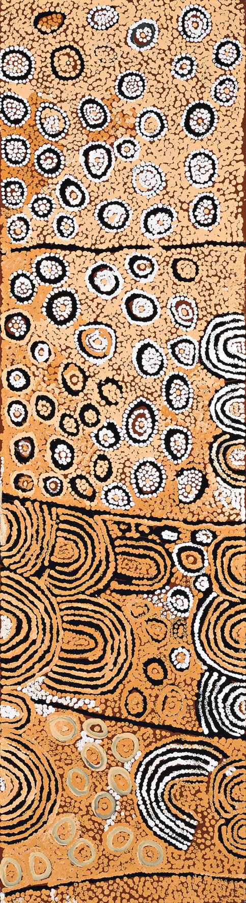 This painting is accompanied by a certificate of authenticity from Papunya Tula Artists Pty Ltd, Alice Springs which reads in part, ‘This painting depicts designs associated with the rockhole and soakage water site of Marrapinti, to the west of the Pollock Hills in Western Australia... A group of senior women camped at this rockhole making the nose-bones which are worn through a hole in the nose-web...’
