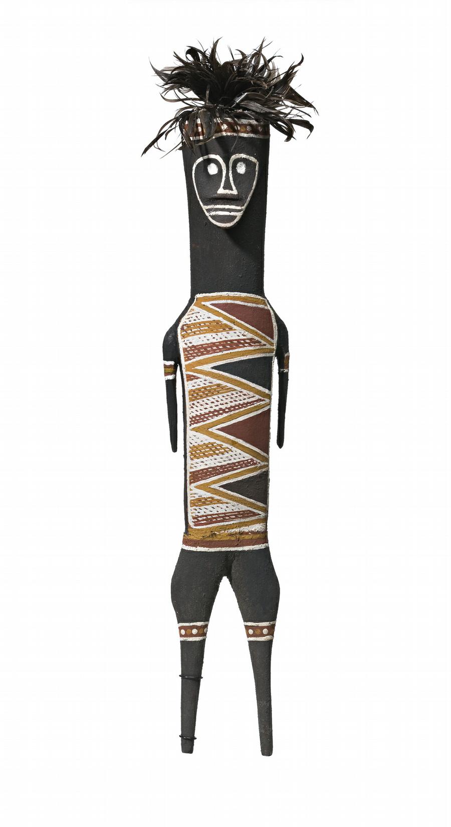 This figure commemorates a Birrkili ceremony. The black triangles symbolise thunder, red is the rain and white is for lightning. The back of the figure is also painted and includes an image of a turtle, a creature which plays a major role in mokoy ceremonies.