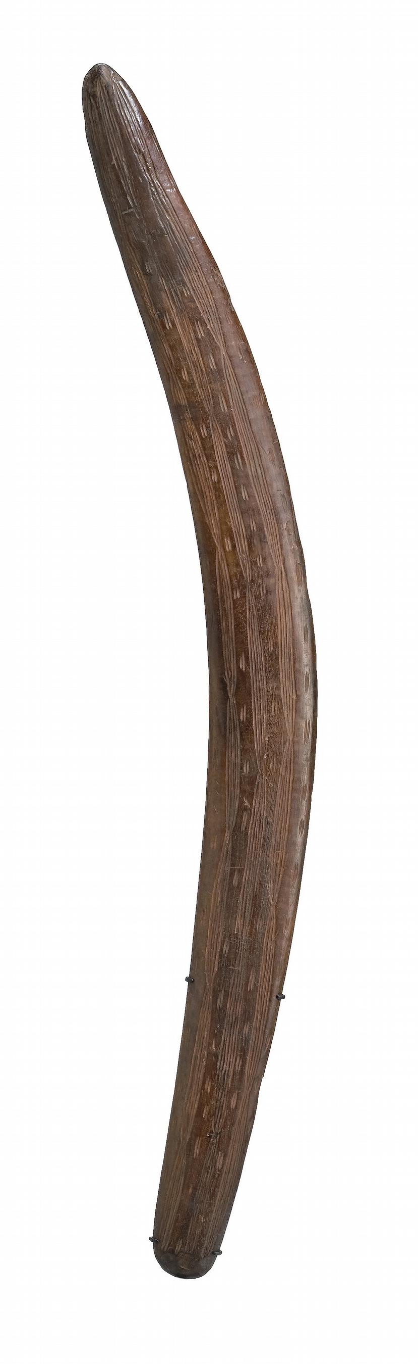 of plano/convex section, the front with traditional linear designs, the reverse with adzed markings