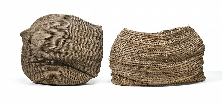 comprising two woven baskets constructed with lawyer cane and bark fibre together with a loop weave bag and a fibre apron of woven bark fibre