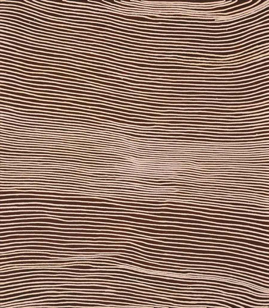 This painting is accompanied by a certificate of authenticity from Papunya Tula Artists Pty Ltd, Alice Springs which reads in part 'This painting depicts the Venemous Snake Dreaming from the soakage water site of Nyinmi, east of Jupiter Well.The snake passed through Wilkinkarra (Lake Mackay) travelling underground and resurfaced east of Nyinmi. At Nyinmi it was killed by a woman and eaten by her two children. However it reformed and kept travelling west. This mythology forms part of the Tingari Cycle. Since events of the Tingari Cycle are of a secret nature no further detail was given.'