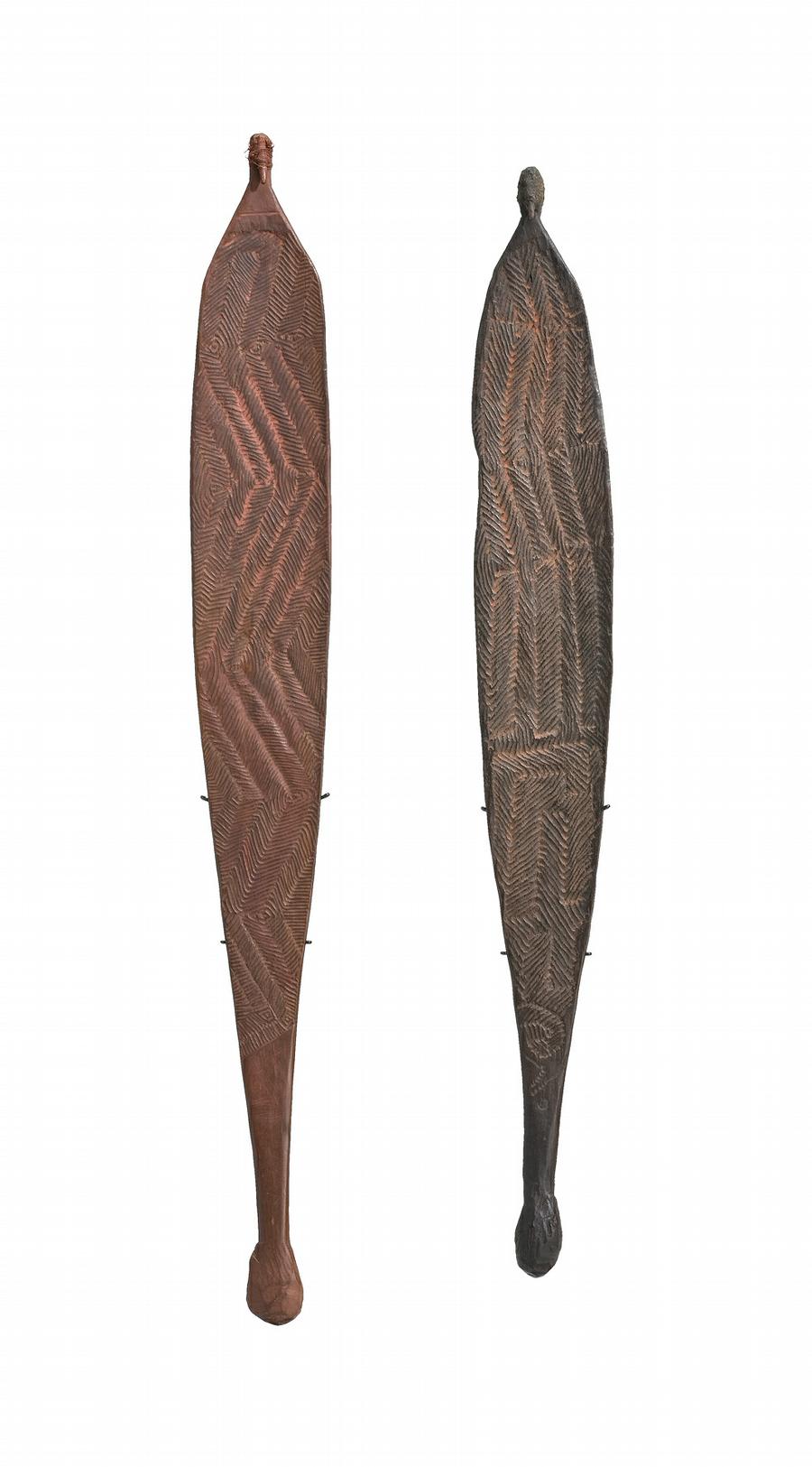 carved in hardwood, the front decorated with incised traditional zig-zag designs in-filled with traces of red pigments and one with a lower bulbous throwing handle