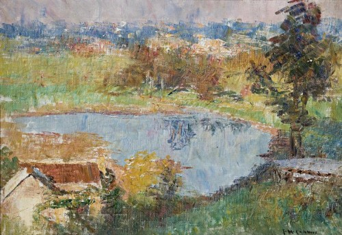 Frederick McCubbin's move to Kensington Road, South Yarra in 1907 introduced some of the happiest and richest years in his art. Many of his finest paintings belong to this time - Winter Sunlight, 1908, in the collection of the Art Gallery of South Australia, Moonrise, 1909 in the National Gallery of Victoria, and Golden Sunlight, 1914, gifted to the Castlemaine Art Gallery and Historical Museum by Dame Nellie Melba, being among the best. He had just returned from his first and only trip to England and the Continent, full of the liberating, painterly influence of J. M. W. Turner, his favourite painter since youth. That influence can be seen in these wonderfully atmospheric paintings, each in their different ways dazzlingly colourful masterpieces, capturing the feelings he expressed in a letter to his old friend Tom Roberts, 'This is the loveliest place I have ever lived. A charming old colonial house' perched right over the Yarra with three acres of garden and trees... The winding stream, gums, osiers and wattle; interspersed. The night effects; sunrise, moonrise, we can see every way.'1 The old garden led to a paddock, which ran down to the Misses Armytage's Como estate. The views over the Yarra were spectacular, whether towards Richmond as in The Coming of Spring, 1912, or the even more panoramic Flood Waters (also known as Rainbow over the Yarra), 1913. Both paintings are in the collection of the National Gallery of Australia, Canberra. A rainbow sometimes appeared in these later South Yarra views, a phenomenon of beauty and a metaphor of harmony. They had their genesis in numerous smaller sketches, spontaneous responses captured with a breadth of technique that gives them their special feeling of freedom and atmospheric delight. Colour Note at South Yarra is an outstanding example, related in subject both to Moonrise, 1909, and Flood Waters, 1913. Painted at the end of the McCubbin property, the building in the foreground was the old cottage where the Como gardener, a Mr. Thomas and his family lived. It was a favourite motif, which McCubbin 'adored to paint'.2 The place had a further significance, McCubbin's daughter Kathleen recalling, 'In the long grass just near this old cottage at Como, I remember seeing two head-stones engraved with the names and dates of departed pioneers.'3 Even in his later years when narrative realism gave way to 'glowing pigment and impressionistic handling'4, McCubbin retained a remembrance for those early pioneers of Melbourne whom he had memorialized in his great triptych The Pioneer, 1904-05, in the National Gallery of Victoria.