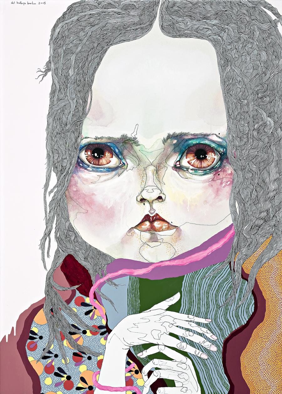 Del Kathryn Barton's work is instantly recognisable by the artists’ compulsive engagement with the decorative, and her exquisitely crafted, hyperbolic imagery of the feminine. As Barton muses, ‘...the obsession with the human form is about me trying to locate myself, to understand being present physiologically. [It is] layered with concerns regarding body politics, sexuality, death, pleasure principles, love, body-boundary confusions. To put it succinctly, I’d say my work is a sort of documentation of my desire to understand what it means to me to be in a woman's body.’1