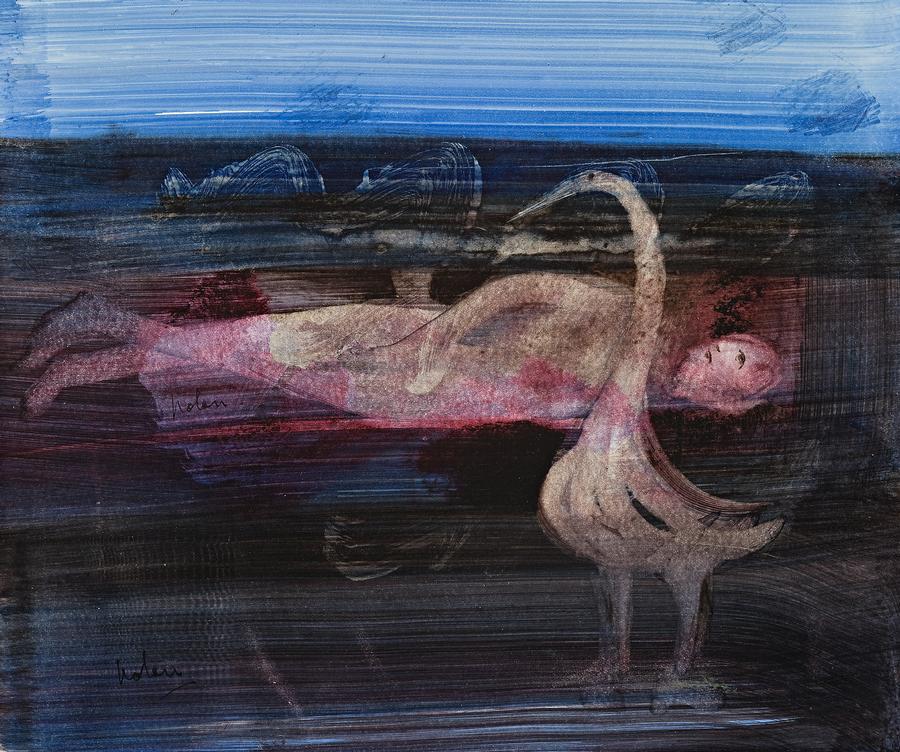 signed, dated and inscribed verso: Nolan. / New York. Oct 6th. 1958 / Mrs. Fraser Series Woman & Heron? / (Leda and Swan)