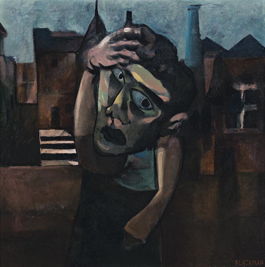 A striking feature of Charles Blackman's early works is his use of physical contortions to express the inner concerns of his figures, and their responses to the world around them. The best known, if not notorious example of this is his marvellous drawing, The Swimmer, 1952, which became a success de scandale when shown in his 1953 exhibition at the Peter Bray Gallery in Melbourne. The angularity and awkwardness of the figure suggests the struggle of the swimmer in the water, a metaphor of ungainly youth coming to terms with life. The same applies to Man in Dark Street, which originally had one of Blackman's 'Schoolgirl' paintings on the verso. The main difference between the two lies in the emphasis on horizontals or verticals. In The Swimmer the horizontality of the flat sea and baths provides the compositional contrast to the flailing of arms and legs - the figure both in and out of his environment. In Man in Dark Street the upright figure, buildings and chimney share a verticality, the arms of the central figure now wrapped around the head or held close to the body - both agonising and protective. The hand with its articulated fingers to the head and the wide-eyed stare speak of those manacles of the mind - such manifestations as 'the black dog' and other horrors, which stalk the id. The look is one of obsessive fixation within a frozen stillness, shadows dark, the framework of forms angular in the formal and colour interplay between figure and architecture, light and dark. The threat seems to be as much within as without.
