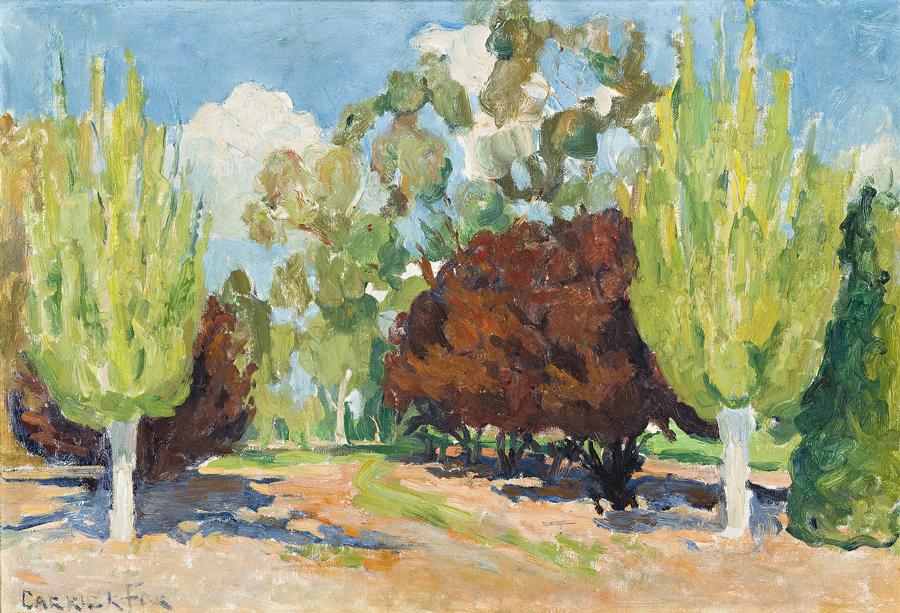 Ethel Carrick and E. Phillips Fox, Macquarie Galleries, Sydney, 14 – 26 March 1944, cat. 1. (as Prunus and Poplar)
