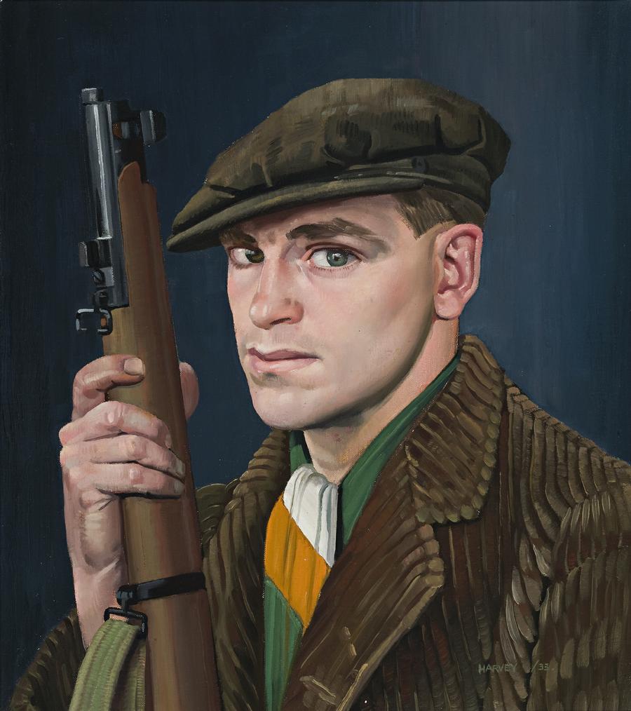 Harvey's Sinn Féin, in all its uncompromising realism is essentially a romantic image of youthful commitment to the ideal of political freedom. Founded in 1905, the Republican Sinn Féin Party sought the independence of Ireland as a sovereign state. The angle of the head, look in the eyes and firm grip on the rifle in Harvey's painting symbolise the determination with which the young Sinn Féiners sought their goal. Apprehension combined with courage indicate that their role is not an easy one. As in the scarf in Harvey's painting, the Sinn Féin adopted the tri-colour of green, white and orange - green of the native Irish clans, orange for the Ulster settlers, and white the peace between the two. As Herbert Badham wrote, ‘Harvey's work is strong, and true and resonant in colour.’5