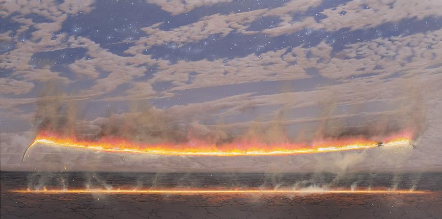 With its sublime beauty and disorienting juxtaposition of real and surreal, Starlight Blaze Line, 2007, encapsulates the highly individual evocations of nature that have brought Tim Storrier such widespread acclaim. Fascinated by the concept of the seemingly endless horizon - and particularly, that exciting point where horizon meets the sky - during the mid-eighties, Storrier began experimenting with three-dimensional constructions of wire, rope and steel which he would install in remote locations and subsequently ignite, capturing the entire dramatic event on cibachrome film. Deriving their impetus primarily from these 'performances', the 'point to point' paintings such as the present thus explore an iconic image whose atmospheric resonance differs widely depending upon the time of day or night.