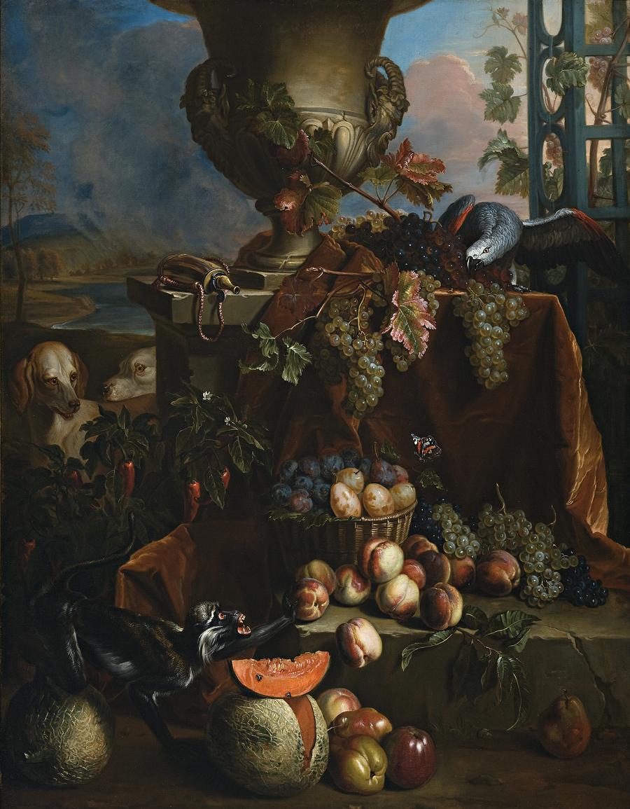 He was admitted to the French Royal Academy in 1699, and succeeded in winning the favour of firstly Louis XIV, then Louis XV, in his long and illustrious career. Appointed as Court Painter of the Royal Hunt and Kennels in 1712, he recorded many such events, illustrating also his patrons’ favourite dogs, as does this work. Earlier in 1712, he visited London, and much in vogue, he sold many significant works to English collectors excited by his imposing and - in the case of this work - dramatic still-life paintings. Many of his most important works have an English provenance, as in the case of this particularly fine example, with its characteristic spill of apples, sliced cantaloupe, grapes, peaches and pears, and an inquisitive pair of hunting dogs, intrigued spectators to a rowdy squabble between a monkey and a parrot - the last two very likely painted from examples in Versailles’ royal menagerie. Innovatively, he was one of the first artists to make landscape studies from nature for his backgrounds - again, illustrated by this work with its distant coastal scene, backed by a range of misty hills.