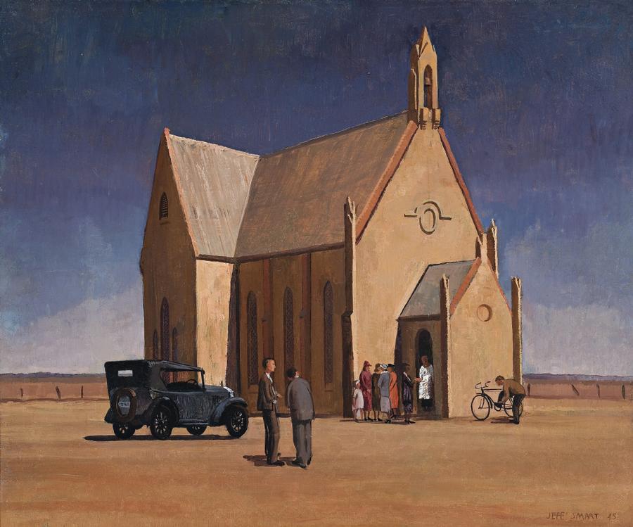 Sunday Morning Service, 1945, by Jeffrey Smart was included in his joint exhibition with fellow South Australian Jacqueline Hick, held at the David Jones Art Gallery, Sydney in 1946. Many of his best works from the period were on show - Keswick Siding, 1945, now in the collection of the Art Gallery of New South Wales, Kapunda Mines, 1946, in the National Gallery of Victoria, and Wasteland I ,1945, and The Holiday Resort, 1946, in private collections. Confirming the quality of Smart's paintings, Hal Missingham, director of the Art Gallery of New South Wales, purchased The Wasteland II from the exhibition for his gallery. Moreover, Louis McCubbin, director of the Art Gallery of South Australia, warmly supported his Adelaide artists in the catalogue foreword, writing perceptively of their styles and attainments. Of Smart he said, ‘…Jeff Smart is attracted by strong and sometimes stark and dramatic effects of form and colour.’ Tatlock Miller writing in the Sydney Sun, however, was less enthusiastic, commenting on their ‘theatricality’ and Smart's ‘tormented skies usually associated with storms over Toledo.’1