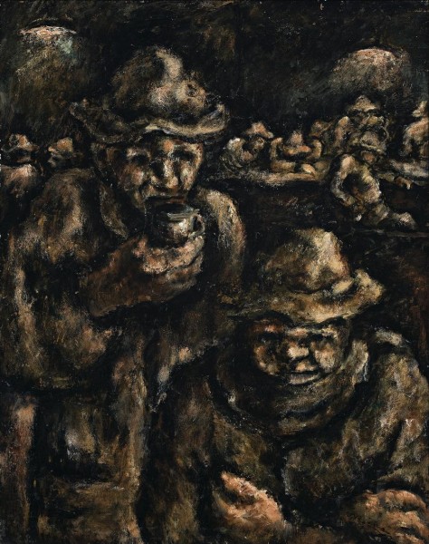 Of Viennese Jewish parents, Bergner grew up in Poland, where he showed an early interest in art. With the rise of Nazism and anti-Semitism in Europe, he joined his family in Australia. Living in the Parkville-Carlton area and working in factories, his painting was strongly social realist, subjects being the poverty-stricken street life of inner Melbourne and Aboriginal Australians. A vital influence within contemporary art circles, in 1941 he exhibited with Noel Counihan and Arthur Boyd at the University of Melbourne. Interviewed about the exhibition, Counihan described Bergner as 'a son of the people'. His world is a plebeian one. He is interested in the poor people and to a certain extent in the people on the fringe of the world he knows.'1 Later, undeterred by the hard work at Tocumwal, Bergner painted every day, especially his unique series on Aboriginal people. The masterly Tocumwal Camp dates from this time, linking it to the plight of the dispossessed and oppressed, of Aborigines, European Jews under Nazism and as refugees. Despite displacement, discrimination, and humiliation, Bergner's Tocumwal Camp, in parallel with his Aboriginal works, speaks of human triumph over crushing adversity, the bulk of the two figures on the very edge of the picture plane dominating the composition. Its haunting though compassionate imagery shows the empathy among the disadvantaged, a vigorous visualisation of camaraderie in misfortune. A related painting, End of a Day's work, Tocumwal, 1942 - 43, is in the collection of the Australian War Memorial, Canberra. The stigma of 'alien refugee' reflected the climate of the time. There had been a military enquiry into unrest in the 6th. Responding to a hunger strike, Bergner wrote 'we had home-cooking in our tents and ate more than ever'.2 He added, 'We were a unique unit though at the time we didn't know it. Such a mixture of different nationalities. If only the world would realize that people with different cultures and habits and languages can live together as we did... But for that, I suppose, the world needs different gauges and a specially strong Lashing Gang.'