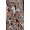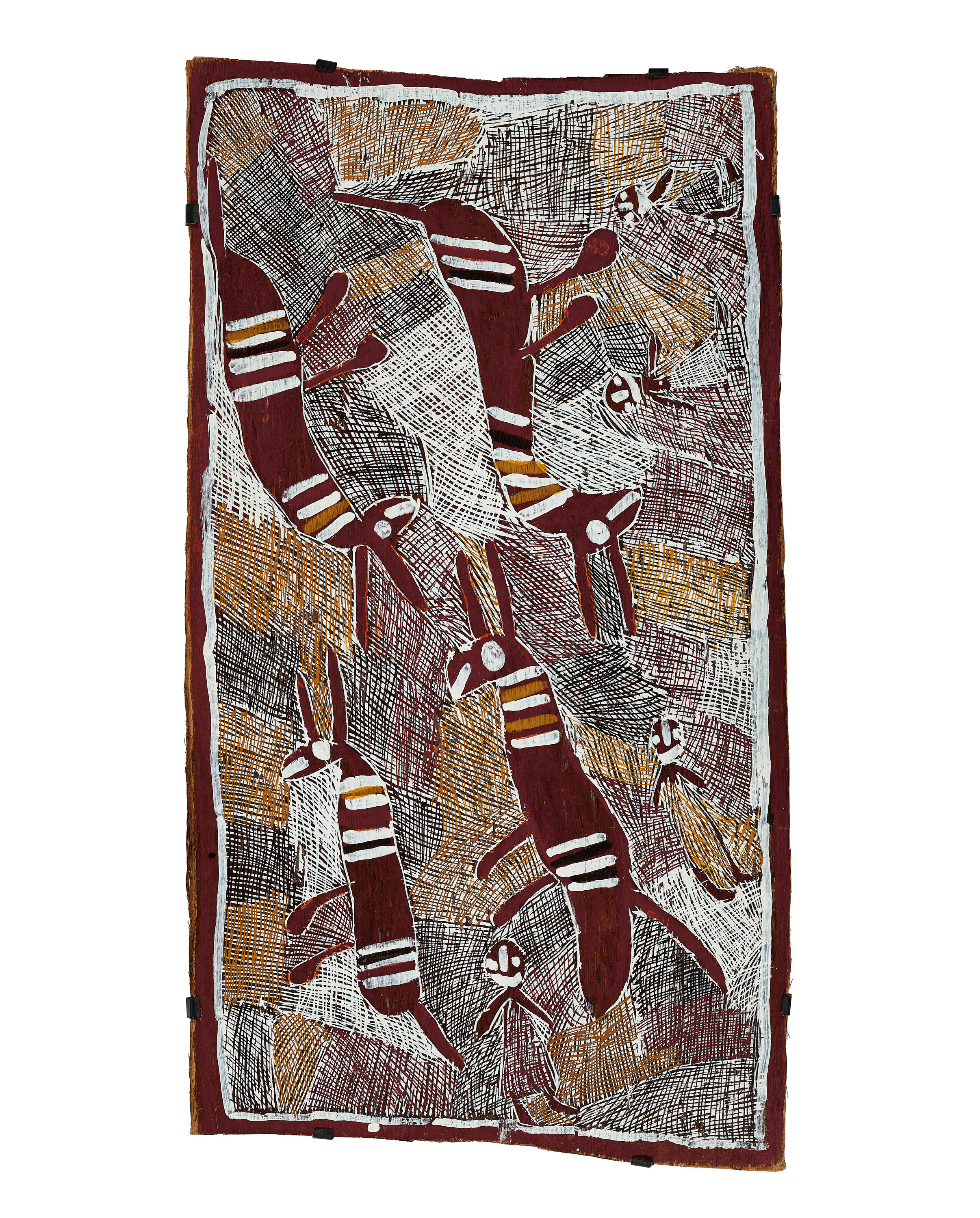 This bark shows the incident in repetitive form. During her travel to Darwin to collect her Award after this work was completed, she was awoken by a dream of the Buffalo’s red eyes staring at her. This work has a dreamlike quality, and the series was nicknamed ‘Wendy in Wonderland’ by irreverent art centre staff. The video outlining the story of this incident is included on the DVD “Nhama” released at Garma 2008.’