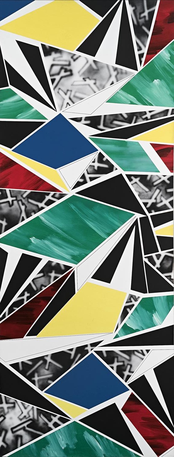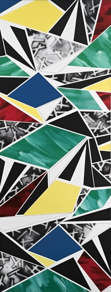 But there was yet another layer to the impetus behind 50s. While he claimed to be inspired in part by a beach bag, he was also well aware that in turn such geometric designs had been appropriated from the striking compositions of Wyndham Lewis (1882 – 1957), one of the founders of the British Vorticist movement, a radical break with tradition founded in 1914 and which gravitated towards depicting the jagged edges of then-modern life.