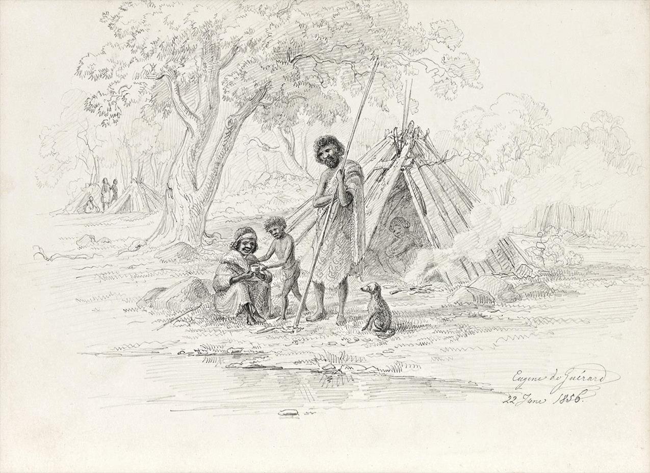 This sensitively drawn portrait of an Indigenous family group and their temporary bark gunya (shelter) dates from a journey Eugene von Guérard undertook in 1856 to Victoria’s Western District. Originally attracted by the lure of finding gold, the Austrian-born von Guérard was unsuccessful as a digger so turned to painting his adopted country instead. Trained at the rigorous Düsseldorf Academy in Germany, his meticulously detailed paintings done in the Romantic tradition of the sublime found favour with Australian audiences, particularly landowners keen to commission grand views of their estates. The trek through the Western District was connected to one such project with this drawing being executed along the way.