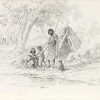 Aboriginal Family Group, 1856 shows surviving individuals from the Gunditjmara people who were the traditional owners of the area now encompassing Warrnambool, Portland, Hamilton and Mt Eccles.1 The Gunditjmara were amongst the first in Victoria to be subjected to frontier violence with a massacre of up to 200 of its people by whalers at Convincing Ground, east of Portland, in 1830, five years before Melbourne’s foundation. This event triggered what is now known as the Eumeralla wars which lasted more than 20 years and decimated their population. Significantly, von Guerard’s host and travelling companion James Dawson was an early champion of the local Aboriginal people, researching and documenting their languages and customs over many years.2 This drawing was originally owned by the Good family, members of which emigrated from Ireland in 1841, settling on a property called ‘Injemira’ just outside Warrnambool. Pullin notes that von Guérard rarely gifted his drawings so it is unclear how this example came to be in the possession of the Goods. What is known is that at some stage either Kate or Mary Good sent it to their sister Margaret (who had remained in Ireland) ‘for her album,’ a scrapbook journal containing her own competent drawings of views, birds, butterflies and flowers; and in which the von Guérard was kept as a loose drawing. Given these circumstances, the featured Indigenous family does not appear in any of the artist’s subsequent paintings though similar portraits often appear in his sketchbooks, an irreplaceable record which reveals von Guérard as a sympathetic observer of the varied indigenous peoples he met on his extensive travels throughout eastern Australia.
