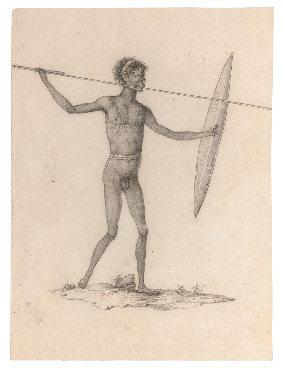 A finely-rendered portrayal of a warrior from New South Wales advancing with his shield raised and spear held in his woomera. Petit has not only signed the work but noted that he drew it while “on board the Géographe”, which firmly dates the work as another voyage piece.