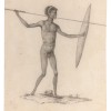 The man has a distinctive profile and, like many of the Sydney Aboriginal people drawn by Petit, has his hair tied back with a simple band. It is possible to make out several details of his distinctive scarification, with long vertical lines on both breasts, a series of shorter horizontal lines on his pectorals, and a long series of short lines around the torso. There is also evidence of some scars on his arms (but these are perhaps battlewounds rather than ornamentation?). Not only does the man brandish his spear, but the shield is very clearly of the famous crossed design seen in the finished plates as red on a white background, and he wears the belt or cincture around his waist which, as one of the plates in Baudin shows, was worn by men when facing combat so as to have a place to tuck in their club.