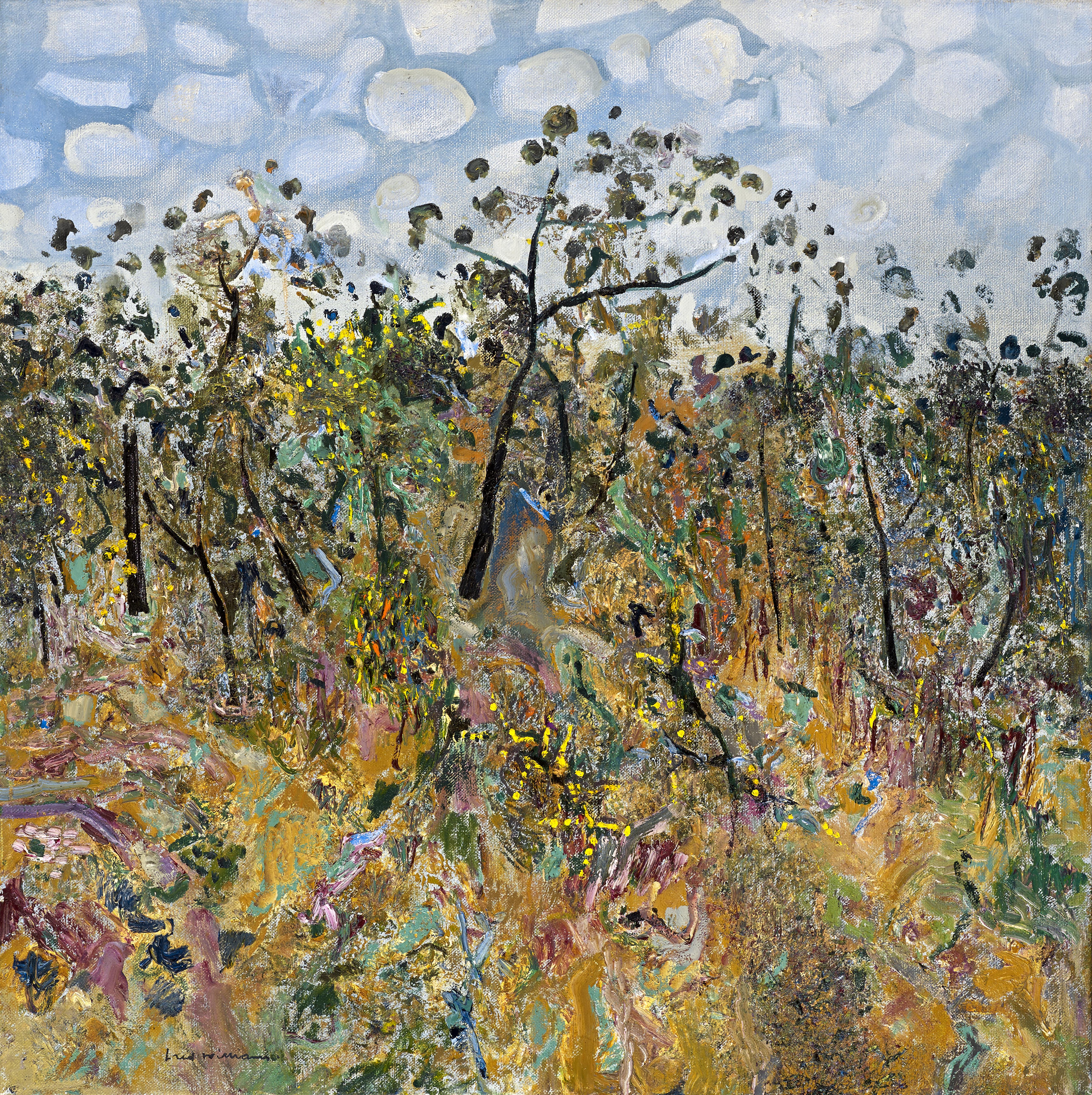 Acacia Landscape with Clouds was painted in 1980, a triumphal one for Williams. Awarded a doctorate of law by Monash University, he held solo exhibitions in Paris at the Australian Embassy, at Fischer Fine Art, London, and the National Gallery of Victoria, Melbourne. A prestigious volume of his art, written by Patrick McCaughey, was published by Bay Books, Sydney. Writing in The Bulletin some years before, the artist-art critic, Nancy Borlase said of Williams paintings: ‘His swirls of crusty paint, his subtly veiled space illusions, his puffs and spills of pigment that so lightly glide down the canvas are, like the late Monet’s, as much abstract as representational – this is the stuff and substance of his art’.3