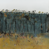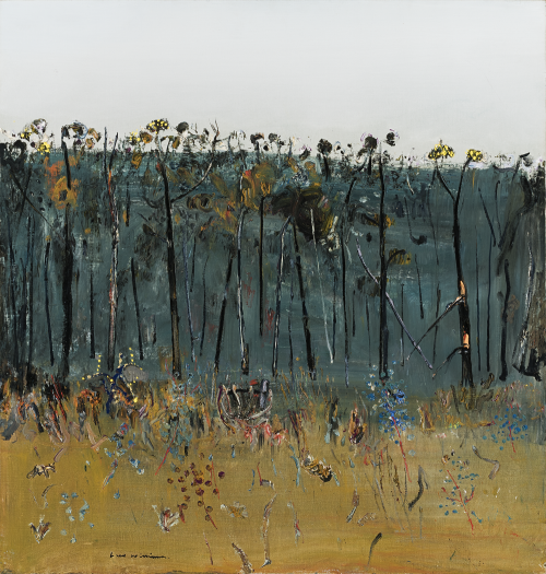 Acacia Saplings, c.1974, full of painterly luxuriance and vitality, captures perfectly Williams’s fascination. Moreover, wattle as a harbinger of spring and regeneration coincided with Williams’s own creative developments, especially the use of a more diverse and richer palette. Acacia Saplings is conceived in three compositional bands. The lighter foreground is animated by an array of lines, curves and swirls of paint, of reds, greens, blacks, purples and mauves. Each is of exquisite hue revealing Williams as a consummate colourist. Richly textured, their three-dimensional character adding to the lively picture surface. Above this rise the black, slender trunked young acacias crowned with their yellow blossoms so cleverly outlined above the horizon. Below, the tangle of trees is set across a field of dark blue-greens evoking illusions of depth and visual enticement. All this pictorial complexity is finally surmounted by a contrasting breadth of relative flatness for the sky, its seeming simplicity veiling an intrigue of colour in harmony with the mastery of this absorbing painting.