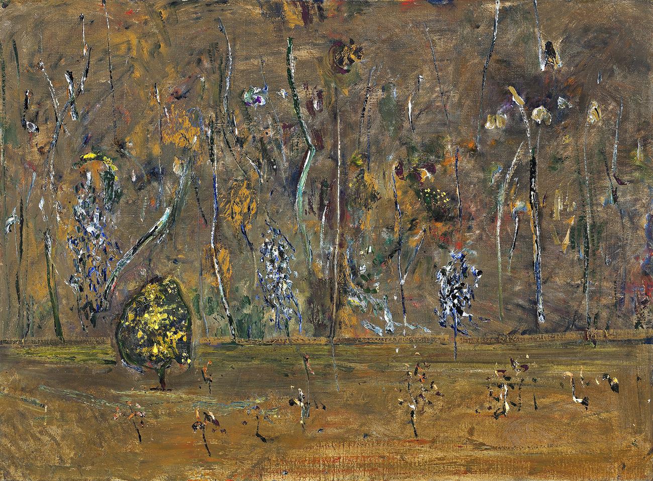 In Fred Williams’ Acacias in the You Yangs II, 1978, golden wattle lights the forest darkness, luminous of palette and texturally rich. Its radiance draws the eye, expectant with the mystery of germination and the promise of spring. Once again Williams displays his wonders of invention in response to the creative powers of nature, singular, visually and intellectually seductive. As master of his art, illusion of depth is balanced by emphasis on the picture plane, leading to an absorbing dialogue between realism and abstraction. Scumbled and calligraphic daubs of paint contrast with painterly luxuriance in the marriage of contraries. Close-up in view, the ascending background and absence of horizon increase the intimacy of the pictured moment. The subtle beauty of the floating forms tells of the felicitous influences of Chinese art, much enjoyed during Williams’ visit to China in 1976.