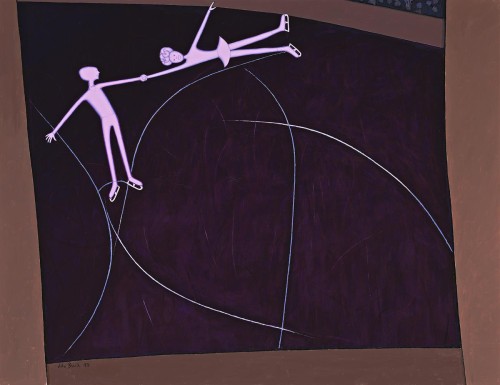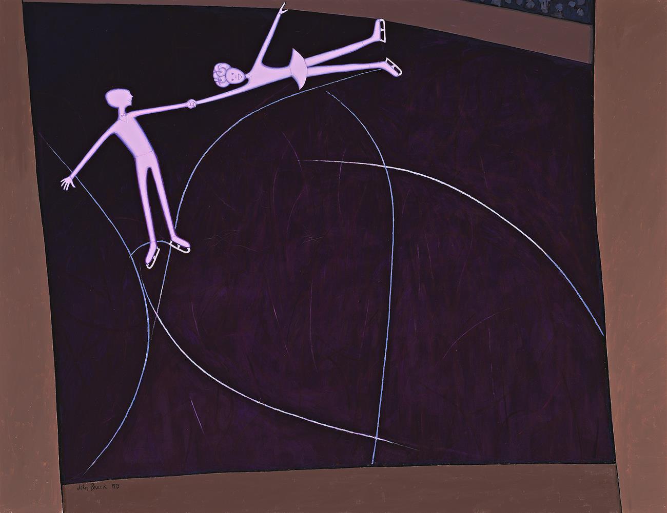 In Up in the Air, 1973 John Brack captures his skaters in an eye-catching but risky move. The painting, however, is much more than mere transcript, abounding with social comment and metaphor. In his earlier skating paintings such as Adagio, 1967 Brack admitted that he had first ‘wanted to make a statement about romantic love...’, but he had been unable to do so, his sensibilities lying in a far different direction.1 Combining the artificial with the theatrical, he worked through the ballroom dancing series and the contortions of the gymnasts before returning to his ice-skaters with different ideas and intentions. In both versions of Up in the Air and Finale, the figures are faceless, losing their individuality and identity as they become increasingly 'abstract' forms within the composition. Figures no longer dominate their settings, small on the rink symbolic of life, of ice thick or thin on which we skate and leave our marks. Nevertheless, the choreography of skating appealed to him, as did the movements of the ballroom dancers; but he scrutinised and recorded them with a coolly intellectual mind. Ever with an eye for the artificial and the put up facade, he admitted to being ‘fascinated by the idea of people who turned pleasure, pastime, into work, labour...’2 Although he was speaking about ballroom dancing, it could be applied equally to gymnastics and ice-skating, the latter with the added edge of greater risk taking. And herein lies the metaphorical references and satire. The surfaces of the ice rink are slippery and full of hidden dangers, a metaphor of the uncertainties of life and how we handle them. Of Up in the Air and the gymnastic Three Pairs, Robert Lindsay wrote, ‘Here an added social metaphor exists in the concept of balance, with the protagonists maintaining equilibrium within the contorting complexities of life.3 When Up in the Air was exhibited in Brack’s solo show at Rudy Komon’s, John Henshaw referred to Brack’s return to ‘the gymnasium and the ice palace’, observing that: