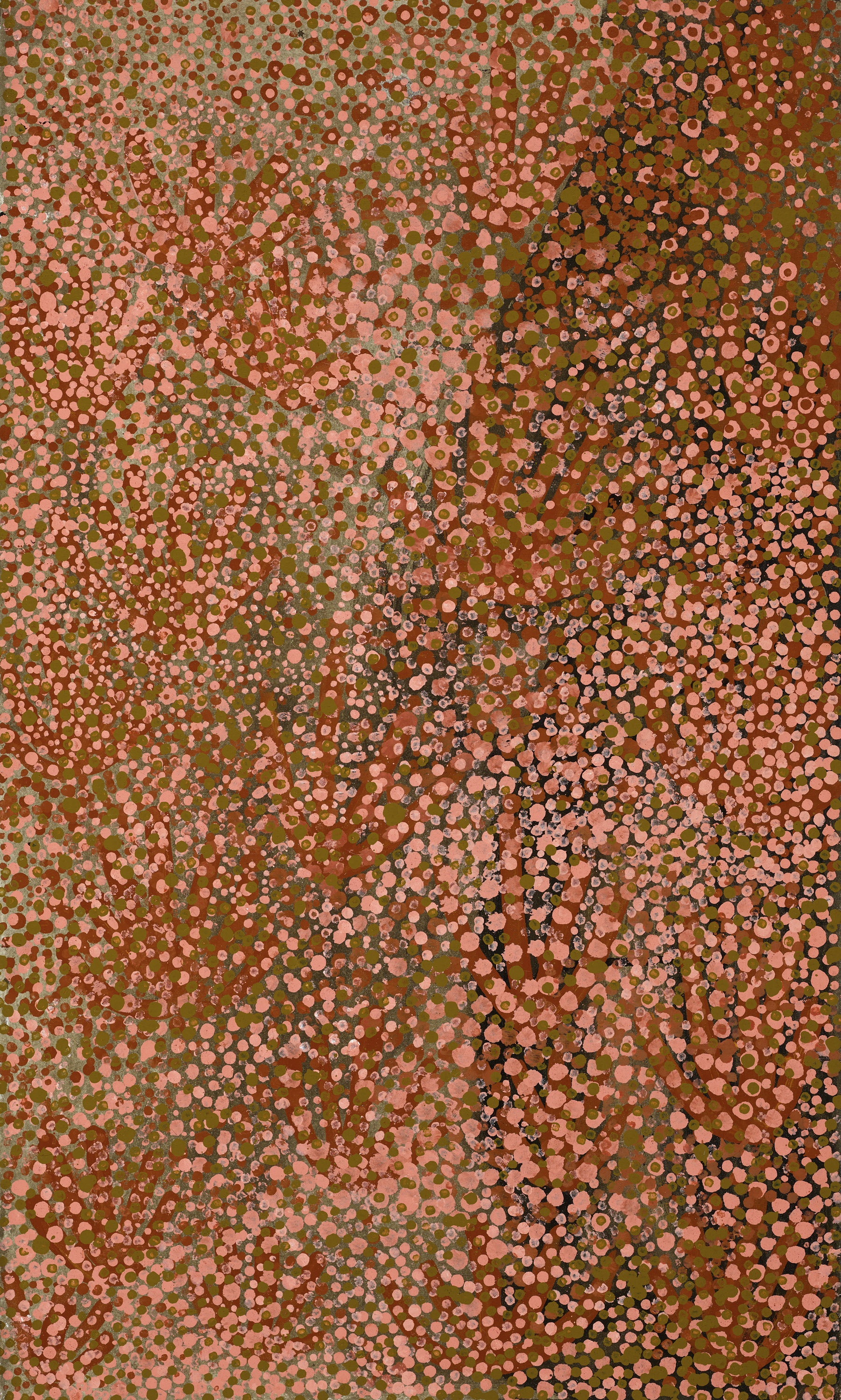 This painting is accompanied by a certificate of authenticity from Delmore Gallery that states: ‘“Alhalkere Country 1990” by Emily Kame Kngwarreye, draws attention to the figurative outline of an unidentified plant underlying the loose nature of dotted workings, both characteristics that we recognise in Kngwarreye’s early works. This is an exploratory work created in those early vigorous days of painting with acrylic paint - extending and giving life to her creative path as an active artist. “Alhalkere Country 1990” aligns with her batik background when working with the fluid hot wax and coloured dyes allowed the emergence of her individual and distinctive loose-handed abstract style. The colour and workings of the dots in this work show that Emily was working with two brushes, where the smaller one was obviously passed its used-by date with its wooden head impacting on the canvas leaving a hollowed-out centre. The murky red ochre dots on charcoal background, the watery creamy white dots, and the light green suggest that plants and their fruit and seed were dried and sparse – in a state of country courting drought. This canvas appeared in September, three months before summer rains could be expected, and at a time of being alert to sense and see indicators of likely rain. With rain, the ceremonies would gather people together in hope of “singing up” a good season – a time to “look after” their country. Significant early works by Emily Kame Kngwarreye have been acquired by the National Gallery of Victoria and collected by other notable institutions and major collectors across the world.’