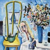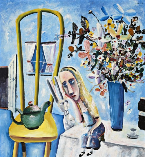 Later, in June that year, a solo exhibition of Blackman’s work was mounted at the Johnstone Gallery in Brisbane which included three paintings from the Alice in Wonderland series, all of which sold to local collectors.16 This trio included The Blue Alice, 1956, eventually acquired by the Queensland Art Gallery in 2000, and Alice on the Table, 1956, priced at 50 guineas, which was bought by Alan Waldron. A luminous picture that glows in its striking emphasis on the interplay of yellow, blue and white, Alice on the Table contains all the hallmarks of a quintessential Alice painting. Wearing a blue dress with white collar and black trim, a golden-haired Alice is centrally placed and seated on a table. Depicted in a reflective pose, her head resting on her hand, she is seemingly unaware of the White Rabbit, ears erect and dark eyes staring, half visible beside her and adopting an identical sideways lean. This physical mirroring of the rabbit and Alice symbolises the intimate relationship between Charles and Barbara, the rabbit’s watchful curiosity a reflection perhaps, of the husband’s fascination with his wife’s gestational metamorphosis. Alice’s figure has evidently shrunk and she is dwarfed by the vivid yellow chair and green teapot on the left and the large blue vase of mixed flowers to the right. The lyrical depiction of these flowers recalls John Perceval’s expressive application of paint, and Blackman’s pure delight in their varied form, texture and colour is on clear display. It is impossible not to relate the flowers, bursting with life and possibility, to the impending birth of the Blackmans’ first child and to think of the paintings of female faces with flowers that emerged soon after. Possibility and promise are also suggested by the open door at the far left of the image which beckons Alice from her indoor world.