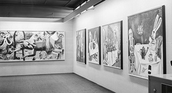 Just as pregnancy had heralded Barbara’s transition from innocence into womanhood, so too it ended her work as a life model, thereby curtailing the earnings that had previously supplemented her pension for the sight-impaired and allowed Blackman the freedom to paint full time. Accordingly, the artist was prompted to find employment as a short-order cook in the Eastbourne Café (better known in its later incarnation as The Balzac Restaurant) in Wellington Parade, East Melbourne. Owned by his friend, European émigré Georges Mora, the bustling restaurant significantly afforded not only a source of income, but a rich repertoire of motifs for his Alice in Wonderland series. As Blackman later recalled, ‘I went to work … at 5pm … and … finished at 12 and then came home and my head was full of spinning plates and teacups, and Barbara would say I brought the rabbit into the restaurant at night and it would help me to do the work, and next day l would paint it all. The restaurant came into the paintings’.4