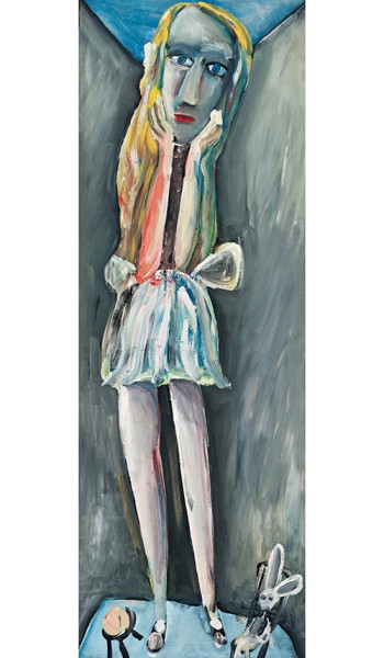 A soulful example from the celebrated series, Alice Tall, 1956 features the protagonist occupying the full height of the composition’s vertical format, squeezed in a tight pictorial corner, her head off-centre, wedged between her yellow hair, grey weeping walls, sloping ceiling and slipping floor. Despite the comic nature of her predicament, Blackman presents her bearing a serious face with tears, represented by the creamy brushstrokes, streaming down her arms and hair into her gushing skirt. Notably reminiscent of the starched pinnies worn by restaurant waitresses, the full apron here perhaps offers a whimsical play on the notion of ‘waiting’, while her tears no doubt also bear allusion to the ‘real’ Alice (Barbara) and her predisposition to crying during her pregnancy.5 Portraying tangibly the tender vulnerability of a little girl’s growing mind – her fantasies and fears, her romantic spirit and sense of humour, the mystery and beauty of her days of wonder – thus Blackman evokes, as Nadine Amadio elucidates, ‘memory of those bursting explosions of childhood when reality and imagination become so entangled they burst at the seams … to shoot up like the tallest adult or close down like the tiniest child – to remember the anguish and joy at the sheer size of the world…’.6